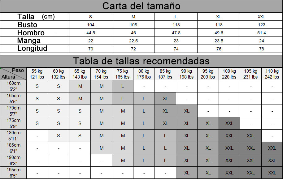 Para obtener el mejor ajuste, elija de acuerdo con nuestra tabla de tallas, si no tiene tiempo para medir y verificar, le recomendamos comprar una talla más grande de la que usa habitualmente. (por ejemplo, si actualmente eres XL, compra 2XL)